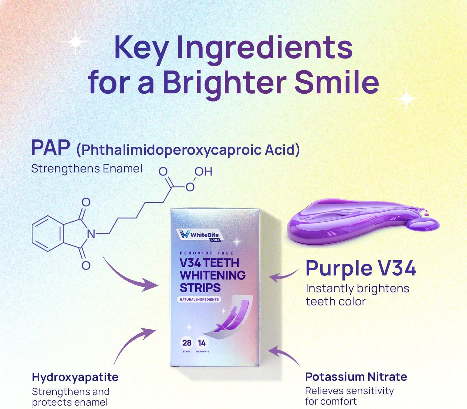 Whitebite Pro Purple Teeth Whitening Strips, 28 Strips (14 Treatments), Enamel-Safe, with Pap, V34 Color Corrector, Hydroxyapatite for Enamel Care, Non-Slip Design